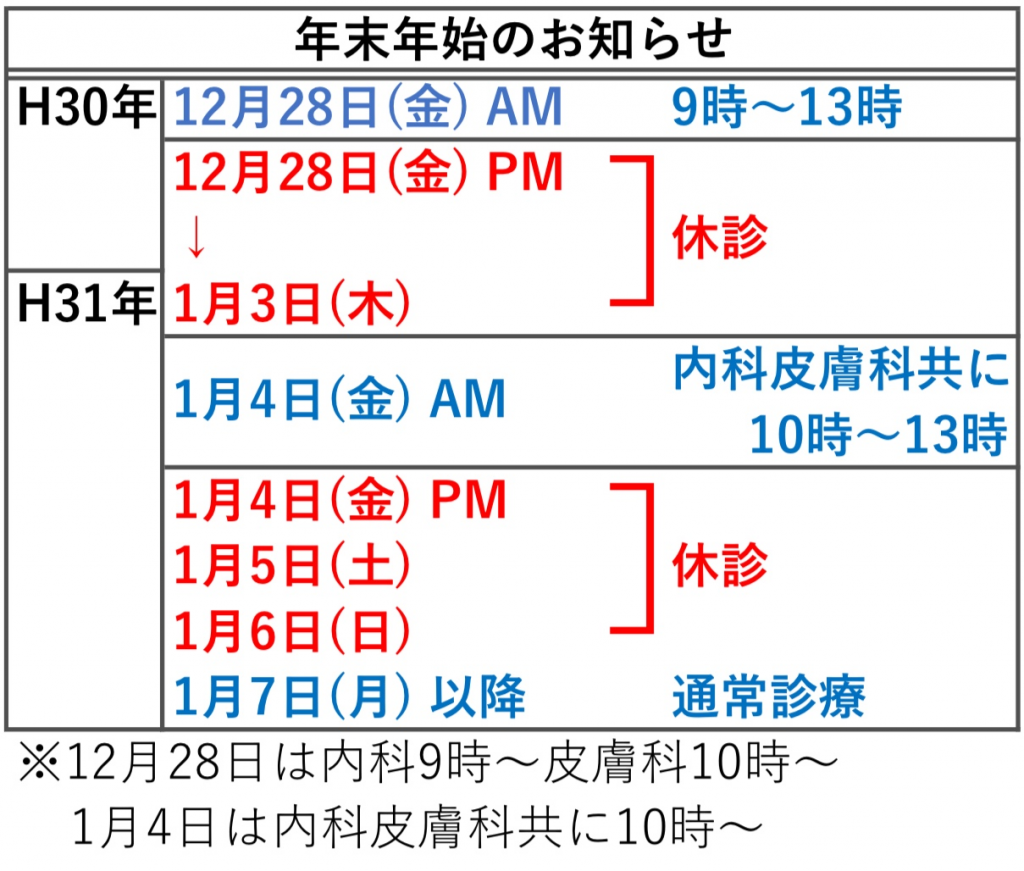 年末年始の休診日のお知らせ 公開日: 2018年12月11日更新日: 2018年12月11日カテゴリー: スタッフブログタグ: 年末年始の休診日のお知らせ 急に寒くなりましたが体調はいかがでしょうか? スタッフより年末年始の休診日のお知らせです。 お間違えのないようにお気をつけてご来院ください。 こちらもオススメです 職員旅行3日目(トマム・支笏湖編) 北海道の旅〜最終日〜 今回は、受付Tが担当させて頂きます♪ 最終日の朝は、なんと…3時半起床!!! それには理由があって…。 早朝にしか見られない、雲海を見に行くためでした! そして、私たちは雲海を見るべく、 雲海テラス […] 公開日: 2024年8月6日更新日: 2024年8月6日カテゴリー: スタッフブログタグ: トマム, 北海道, 支笏湖, 水中遊覧船, 職員旅行, 雲海 はしかの予防接種+GWの診療日のお知らせ こんにちは。 福澤内科・皮フ科クリニックのスタッフMです。 本日は最近ニュースでお目にかからない日はない「はしか」についてお話したいと思います。 当院でも毎日、はしかの予防接種についての問い合わせに対応させていただいてま […] 公開日: 2018年4月28日更新日: 2018年4月28日カテゴリー: スタッフブログタグ: GWの診療日, はしか, 予防接種 ワイン会 こんにちは!スタッフのKです。 先日、中区にあるオステリア モカイオにて先生方とスタッフで夏のお食事会をしました。 このお店はトスカーナ料理店で、患者のKさんに紹介していただきました。 店員さんも細かく気配りをしてくださ […] 公開日: 2019年8月20日更新日: 2019年8月20日カテゴリー: スタッフブログタグ: オステリア モカイオ, トスカーナ料理, ワイン会 この投稿へのトラックバック トラックバックはありません。 トラックバック URL