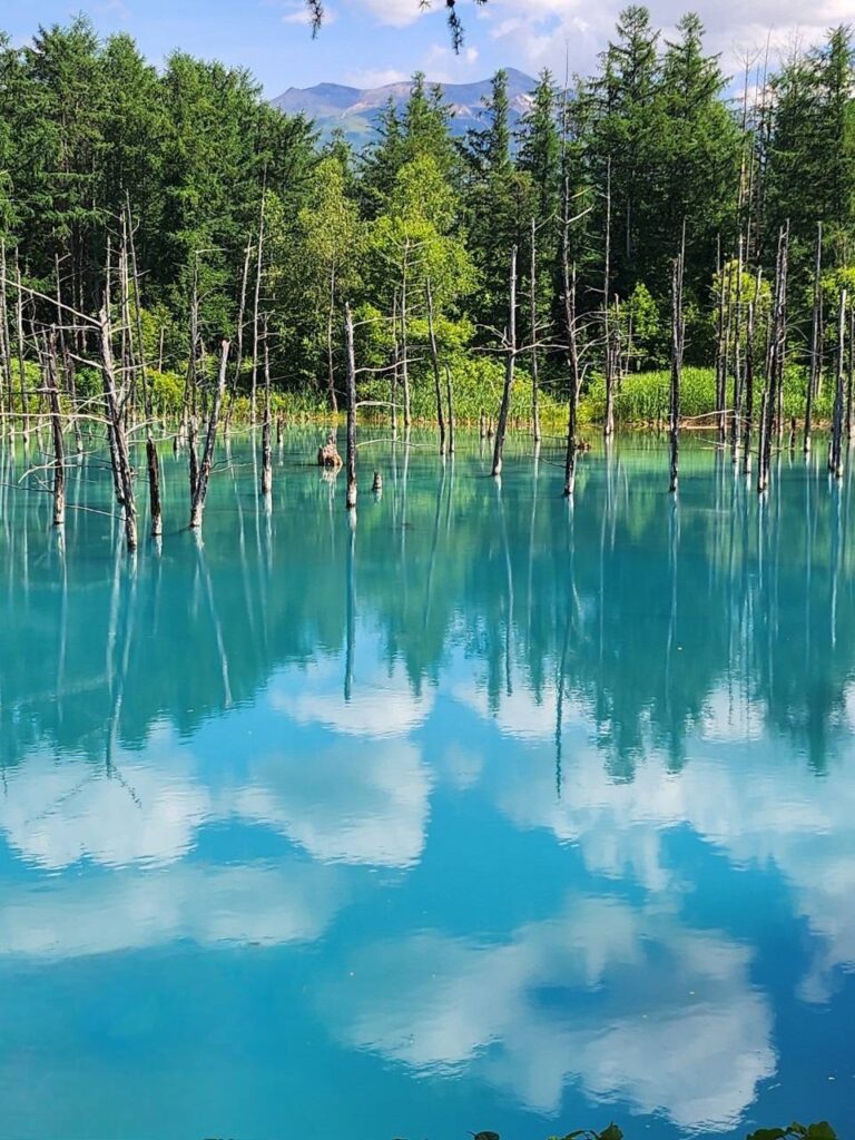 なんとか車を停められる場所を見つけて1km歩いて青い池へ