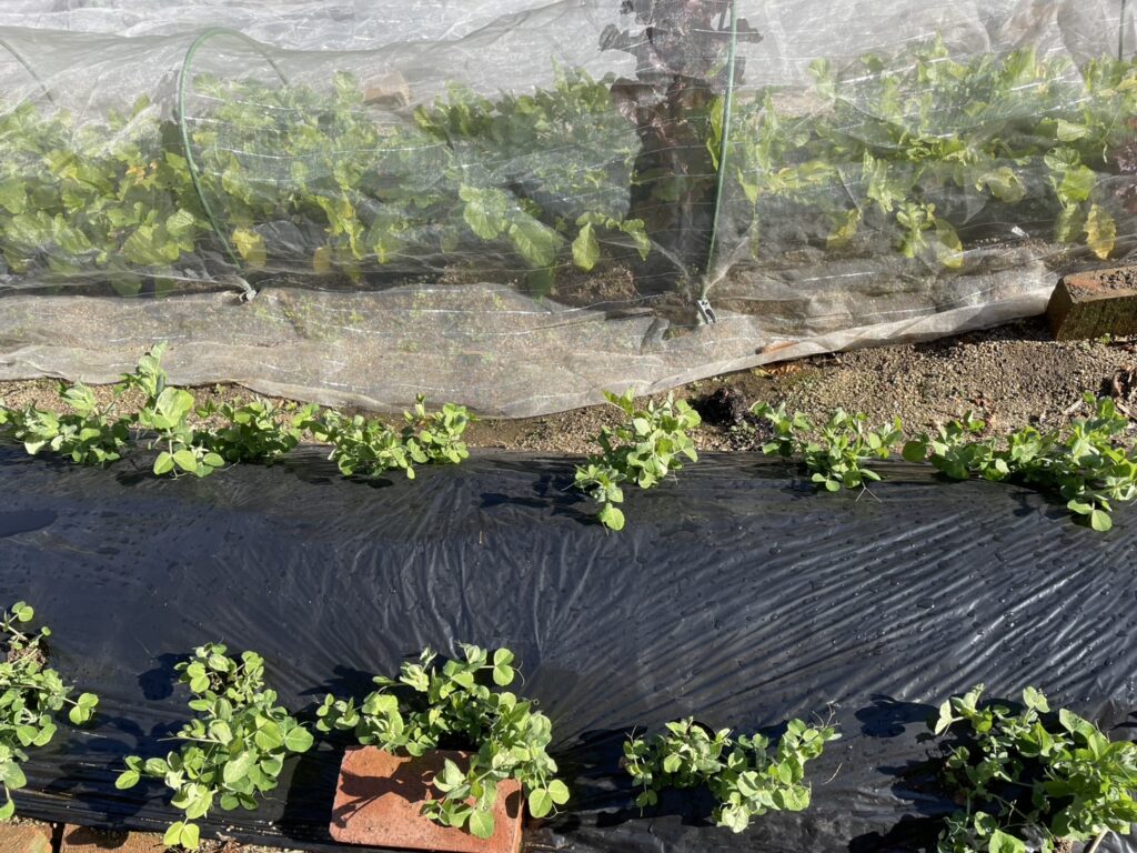 庭に出てみると鳥よけのネットを被せていたエンドウの苗が窮屈そうにしています。