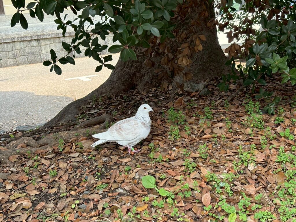 駐車場に向かう時に白い鳩を見つけ、縁起が良さそうとつい拝んでしまいました。
