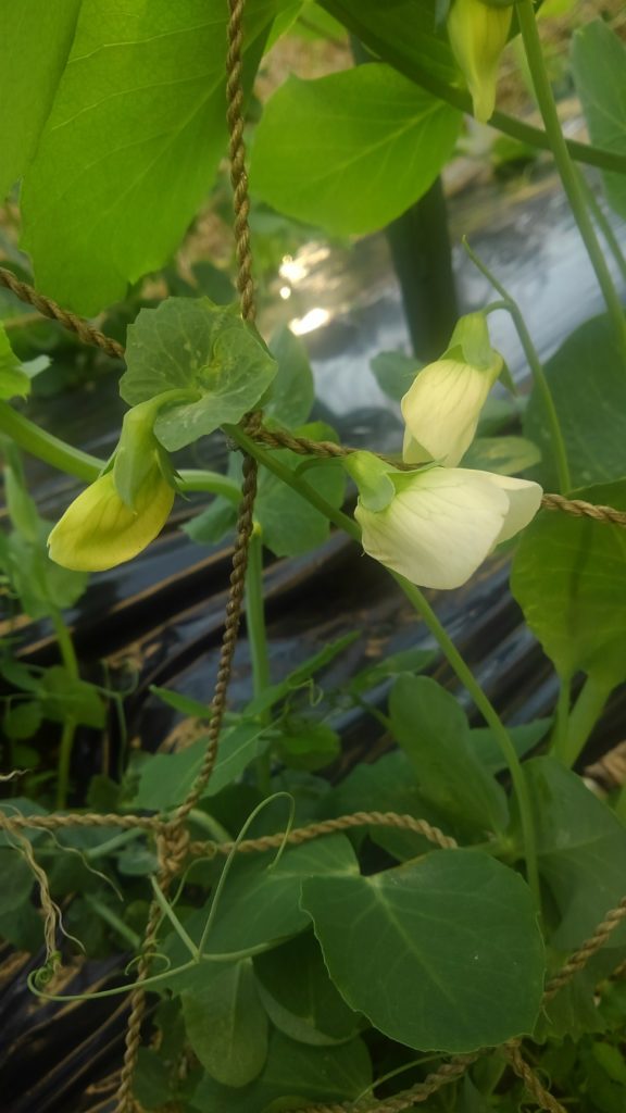 毎年11月頃に種を撒くと、発芽して越冬したエンドウ豆は3月末か4月から花を付けて実がなります。