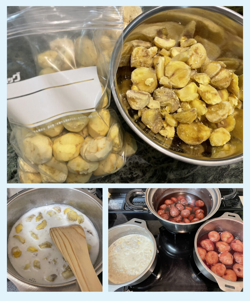 恵那の栗を栗きんとんにしたり、渋皮煮にしたり、モンブランにしたり。栗を剥いて砂糖をまぶして冷凍したら使いたい時に栗ご飯にもなります。
