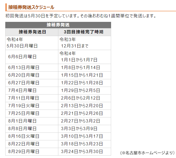 接種券がいつ届くのかと訊かれる事がありますので、名古屋市のホームページに掲載されている「接種券発送スケジュール」を以下に載せておきます。