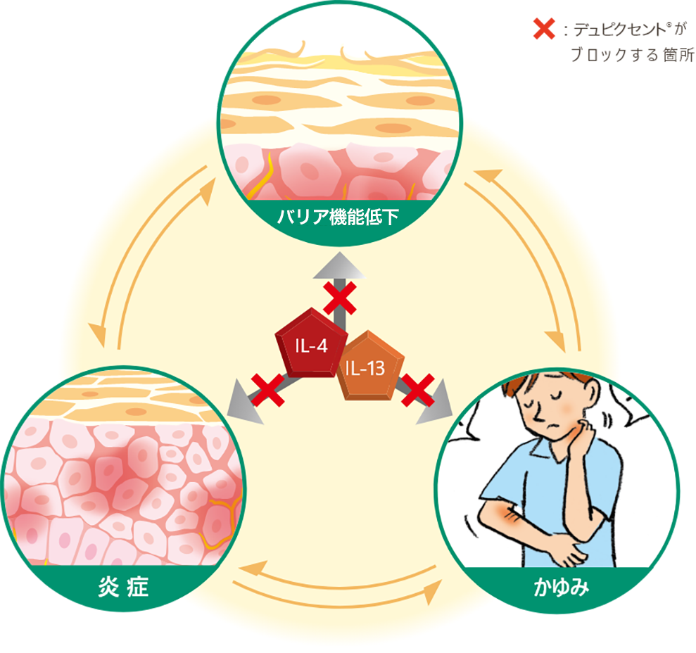 デュピクセントは「IL-4」と「IL-13」という物質の働きをピンポイントで抑えることでアトピー性皮膚炎の主な要因である「炎症」「かゆみ」「バリア機能低下」のすべてに対する効果が期待できます。