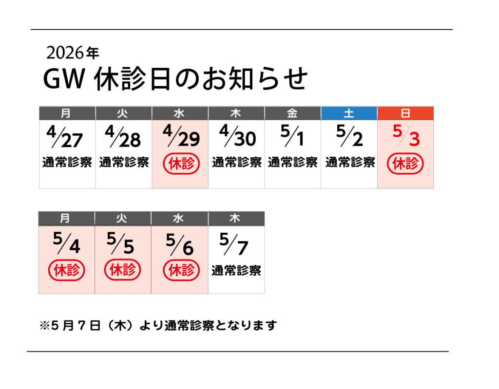 GW休診日のお知らせ 公開日: 2026年3月31日更新日: 2026年3月31日カテゴリー: お知らせ ゴールデンウィーク期間中 4月29日(水)、5月3日(日)~5月6日(水)は休診となります。 5月7日(木)~通常診療となります。 こちらもオススメです 土曜日の診察(4月~7月)のお知らせ 4月~7月の土曜診察日について クリニックは第1・3土曜日が診察日です。 4月4日、18日 5月2日、16日 6月6日、20日 7月4日、18日 は診察を行っています。 公開日: 2026年3月31日更新日: 2026年3月31日カテゴリー: お知らせ 4月1日(水)の皮膚科診察について 4月1日(水)の皮膚科診察はM医師から福澤加奈子医師に変更になります。 公開日: 2026年3月31日更新日: 2026年3月31日カテゴリー: お知らせ 10月から診療時間が変わります。 診療時間が以下の通り変わります。 ご迷惑をおかけしますが、よろしくお願いいたします。 公開日: 2025年7月15日更新日: 2025年7月17日カテゴリー: お知らせ この投稿へのトラックバック トラックバックはありません。 トラックバック URL